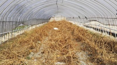 途中からニワトリも手伝ってくれて、ハウス1棟当たり1時間半でマルチまできれいになりました。