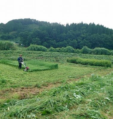 由布農業サポートさんからハンマーナイフモアを借りてきて、研修生の佐藤さんに草刈りしてもらってます。