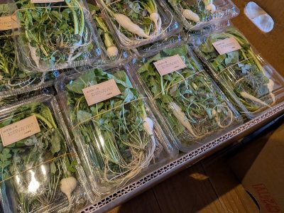 今年は2日から大雪で思うように収穫ができず、シール張り担当の子供は部活で手伝えず、発送担当のアルバイトさんは高齢のため2人とも体調が悪いと今年は不参加で、てんてこ舞いでした!4日の夕方までに注文があった分は無事に発送を終え、あとは直売所の分を作るだけです。パックにちょうどの大きさに大根はできるか?鹿にはこべらを食べられないか?小川のセリの上をカモが踏みたくらないか?などなど毎年ヒヤヒヤしますが無事に終わったあとのアイスは最高です!